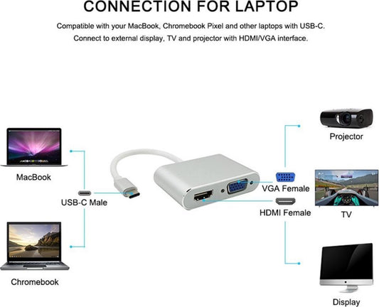 USB-C naar HDMI + VGA Adapter - USB-C Hub - 20 cm - Zilver